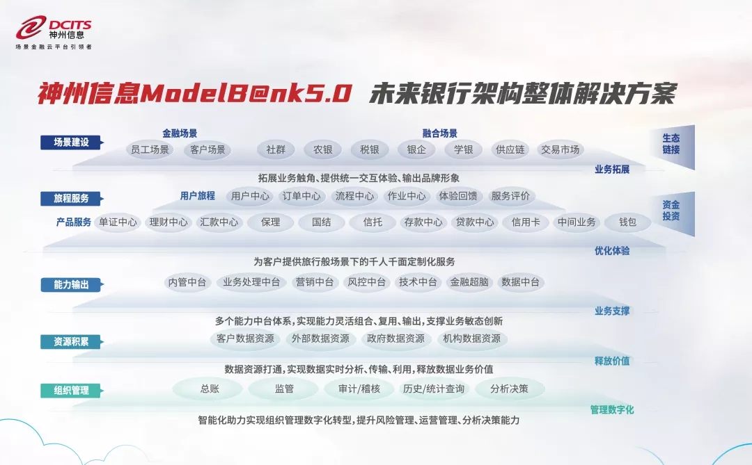 神州信息ModelB@nk5.0是继2000年发布第1代后更新至第5代,旨在为银行业的应用架构提供指引蓝图,以技术中台、数据中台以及金融超脑为支柱,围绕 “场景建设” “旅程服务” “能力输出” “资源积累” “组织管理”五个层次的业务发展述求提供清晰的数字化支撑能力,助力金融机构释放业务价值,为金融机构IT架构演进带来方向性指引。