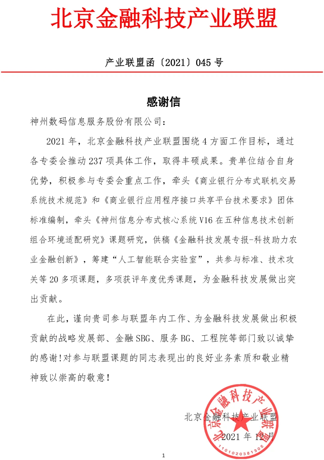 来自北京金融科技产业联盟的感谢信